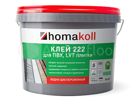 Клей Homakoll 222 – готовый клей для впитывающих воду оснований. Предназначен для приклеивания напольных модульных ПВХ и LVT покрытий, а также рулонных напольных покрытий на разных подосновах: вспененной, джутовой, войлочной и тканой.